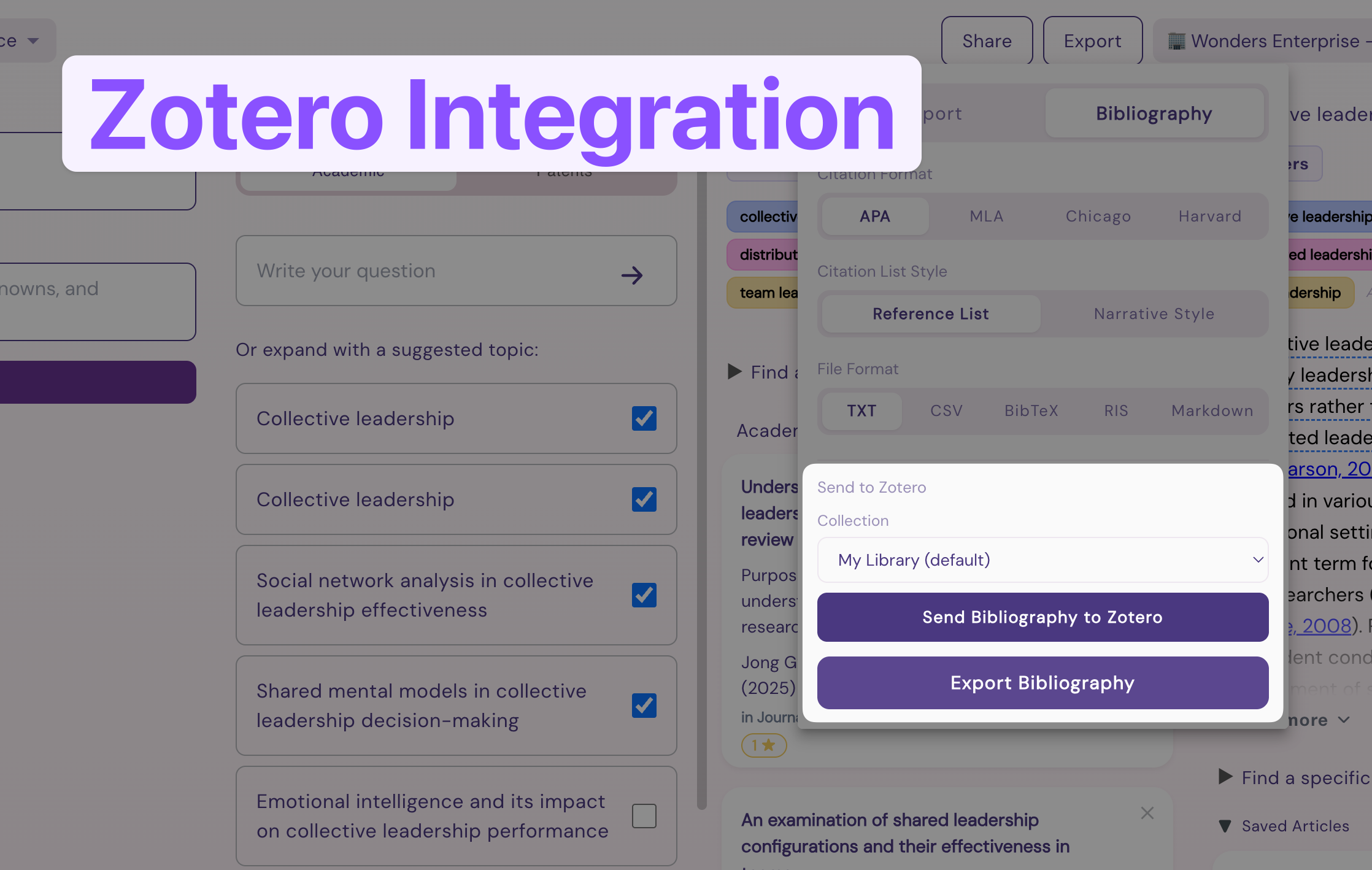 Zotero integration is now available in Wonders! Connect your Zotero account in Settings or in the Export > Bibliography dialog and push your Wonders findings directly into Zotero.